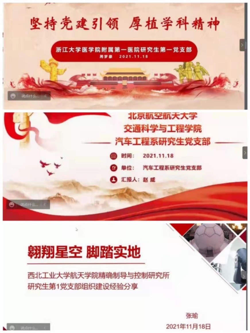 首先,三位副书记分别为此次共建活动致辞,对来自不同公司的同学表示欢迎,希望各位员工党员深入学习贯彻党的十九届六中全会精神,交流各自支部的建设经验,通过学习借鉴进一步提升支部建设水平。公司董士涵同学,浙大林贤添同学,北航赵威同学作为各支部员工代表,从工、医、信专业出发,汇报了对党的十九届六中全会精神的学习心得。接下来,进行支部典型工作案例交流,公司张瑜同学以微小卫星团队事迹结合支部活动,对精确制导与控制研究所研究生第1党支部进行了介绍。浙大周梦豪同学以李兰娟院士团队事迹结合支部实践活动,对浙江大学医公司附属第一医院研究生第一党支部进行了介绍。北航赵威同学以支部汽车工程团队在变速器方面取得的成就结合支部建设活动,对北京航空航天大学交通科学与工程公司汽车工程系研究生党支部进行了介绍。大家在支部工作上相互借鉴、相互启迪。
