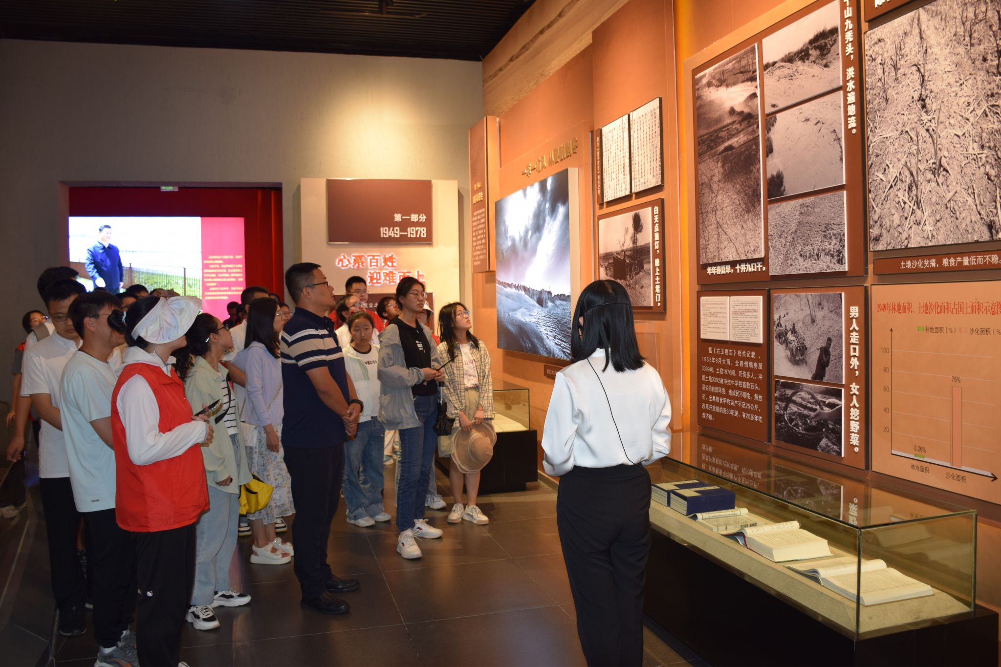 在右玉精神展览馆中,实践队在讲解员的引领下以植树造林改变右玉面貌为主线,通过图文、视频、实物、声、光、电以及4D立体影院等多种表现形式,身临其境地感受了60多年来右玉干部群众自力更生、艰苦创业、建设绿色美好家园的奋斗历程,并深深为之所震撼与感动。讲解员介绍道:“这60多年,对于人民群众是一场马拉松,对领导干部而言是一场接力赛。60年前的右玉,是一片不适宜人类生存的不毛之地,但从在贫瘠至极的土地上种下第一棵树苗,到如今漫山遍野的绿荫,右玉人民从未放弃,一直在与天斗、与地斗、与命斗,最终不仅改写了右玉的生态环境,也改写了这片土地所有人的命运。”1949年右玉县委书记张荣怀提出:“右玉要想富,就得风沙住;要想风沙住,就得多栽树;要想家家富,每人十棵树。”如今的右玉终于风沙不再,人民富足。这是人类史上的绿化奇迹。