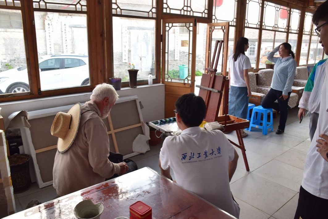 图为实践队员在右卫艺术粮仓美术馆与国际知名画家交流。