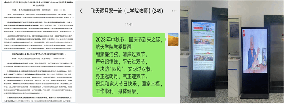 【强化意识 严守纪律】中秋节、国庆节来临之际,航天公司党委坚守节点,做好纠“四风”树新风工作,下发了近期中央纪委国家监委公开通报的违反中央八项规定精神典型问题、陕西省纪委监委公开通报的违反中央八项规定精神典型问题等案例开展学习,向党员领导干部、全体党员发送“中秋节、国庆节党风廉洁提醒”短信,在公司电子屏播放“@全体党员干部,这份清廉过节指南请查收”、“清廉家风丨有国才有家”等教育警示图片和视频,营造清廉过节的浓厚氛围,增强遵守党纪国法意识,夯实干事创业思想基础。