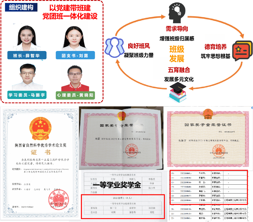 班级建设:22102-1班由23名博士生组成,其中男生19名,女生4名,党员人数16名,占总人数的69.57%。班级始终遵循“以培养‘总师型’人才为目标”的班级理念,倡导以党建带班建,党团班一体化建设,注重组织建构,适时调整班干架构。发挥班长在集体建设中先锋作用,增强班级归属感,同时发挥团支书引领作用,筑牢思想根基,并以特色活动为抓手,发展多元文化,最终成为一个有凝聚力的班集体。在过去一年里,他们硕果累累。班级课程加权平均分,89.35分,位于年级第一;综合测评也位于年级第一,国家奖学金3人次、ballbet贝博martini一等学业奖学金13人次、省级优秀员工干部1人次,陕西省自然科学优秀学术论文奖1人次。