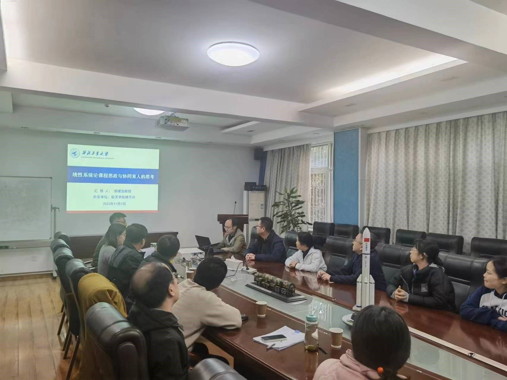 ballbet贝博精确制导与控制研究所所长郭建国教授、党支部书记卢晓东和教职工15人参加了交流会和主题党课活动。首先,郭建国教授以“线性系统理论课程思政与协同育人”为主题讲述了在“线性系统理论”课程教学中所采用的课程思政方法,并总结了协同育人的理念与措施。“线性系统理论”课程是公司控制类公共专业基础课程,该课程和教学团队2022年分别获ballbet贝博martini课程思政示范课程和课程思政团队。郭建国教授以家国情怀、责任担当、思辨能力培养和航天工程事例等四个维度,详细介绍了线性系统理论课程开展教学思政的相关事例和融入课程的教学方法。同时也从课程育人、实验育人和实践育人等方面介绍了教学团队在协同育人方面的特色做法和取得的成绩。随后,参会党员和教师针对课程思政和立德树人等方面进行充分的交流和讨论。