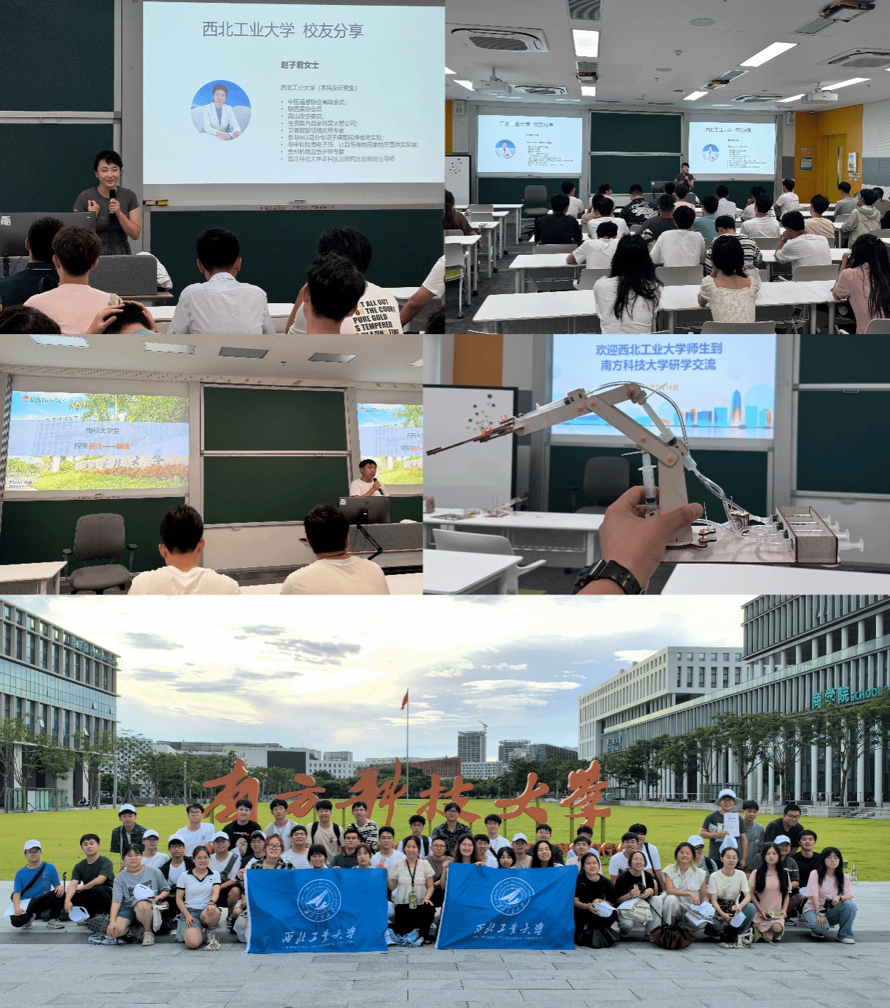 南方科技大学学术交流。作为西工大员工,南方科技大学的赵子君老师为同学们分享了她从学习到工作中的一些感悟与方法论,赵老师告诉同学们,“要创新,要大胆,做别人不敢做的事”,并且非常支持和看好同学们的各类创新想法,她也希望可以与西工大的员工加强交流,发展共赢。黄佳伟博士以“探索设计——制造”为主题,向同学们介绍了南科大的培养模式以及平时南科老员工的学习状态与学习生活,并且向同学们分享了他自己研发制作的四足机器狗,并且让每位同学动手操纵,组装了一个简易的机械臂装置。南科大一行拓宽了同学们的眼界并且很好地培养了同学们的动手能力以及社会交际能力。