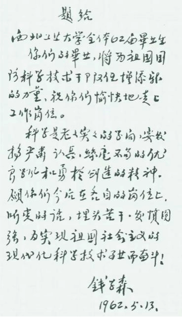 “你们的毕业,将为祖国国防科学技术干部队伍增添新的力量,祝你们愉快地走上工作岗位。科学是老老实实的学问,要发扬严肃认真、丝毫不苟的优良学风和勇于创造的精神。愿你们今后在各自的岗位上,听党的话,埋头苦干,发愤图强,为实现祖国社会主义的现代化科学技术事业而奋斗!”这是1962年5月13日钱学森给西工大1962届全体本科毕业生的寄语,这样的希望成为了西工大历届毕业生献身国防的追求和动力。一批批西工大学子投身到祖国的航空、航天、航海事业建设当中,默默奉献,成就辉煌,涌现出了6名全国十大杰出青年等一批杰出代表。