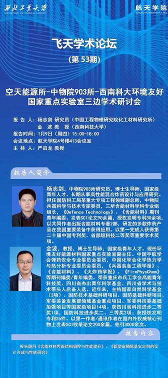 为进一步推动学术交流与合作,拓宽科研人员的学术视野,ballbet贝博空天能源技术研究所联合中物院903研究所、西南科技大学环境友好国家重点实验室举办了三边学术交流活动,有幸邀请到了两位在该领域具有卓越成就的专家学者—杨志剑研究员与金波教授,就含能材料前沿研究进行精彩的学术报告,为我单位的科研人员带来了一场知识的盛宴。