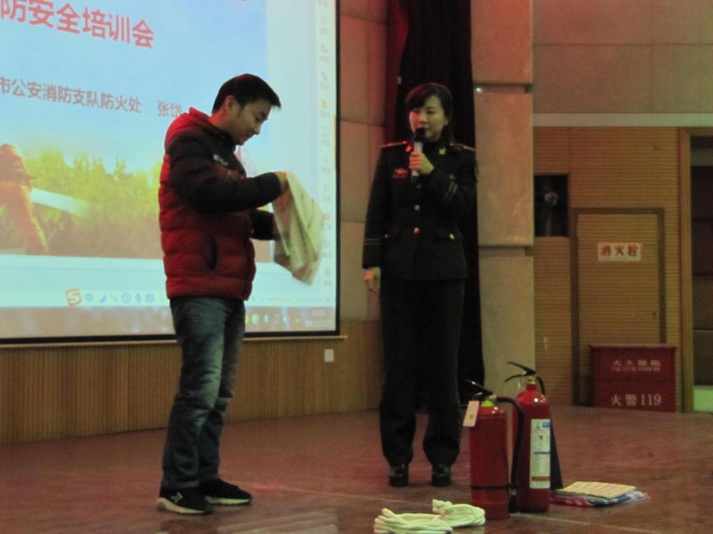 随后,张岱工程师亲自示范了常见灭火器和消防栓的用法,并邀请现场物业工作人员和员工上台,演示和传授了“毛巾捂口鼻逃生”、“结绳逃生”以及“转移火场昏迷人员”的具体做法和注意事项。通过实际演示,有效地向大家传授了诸多逃生技巧。